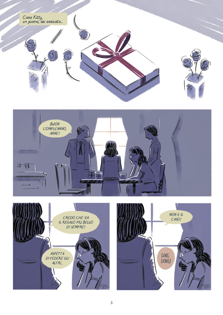 Non è la prima volta che il diario della giovane Anne si presta ad essere reinterpretato come fumetto, il lavoro di analisi e comprensione dell’opera letteraria da parte dello sceneggiatore si fonde allo stile di disegno essenziale di Nadji, rendendo le azioni e riflessioni della protagonista vivide e mai distanti.
