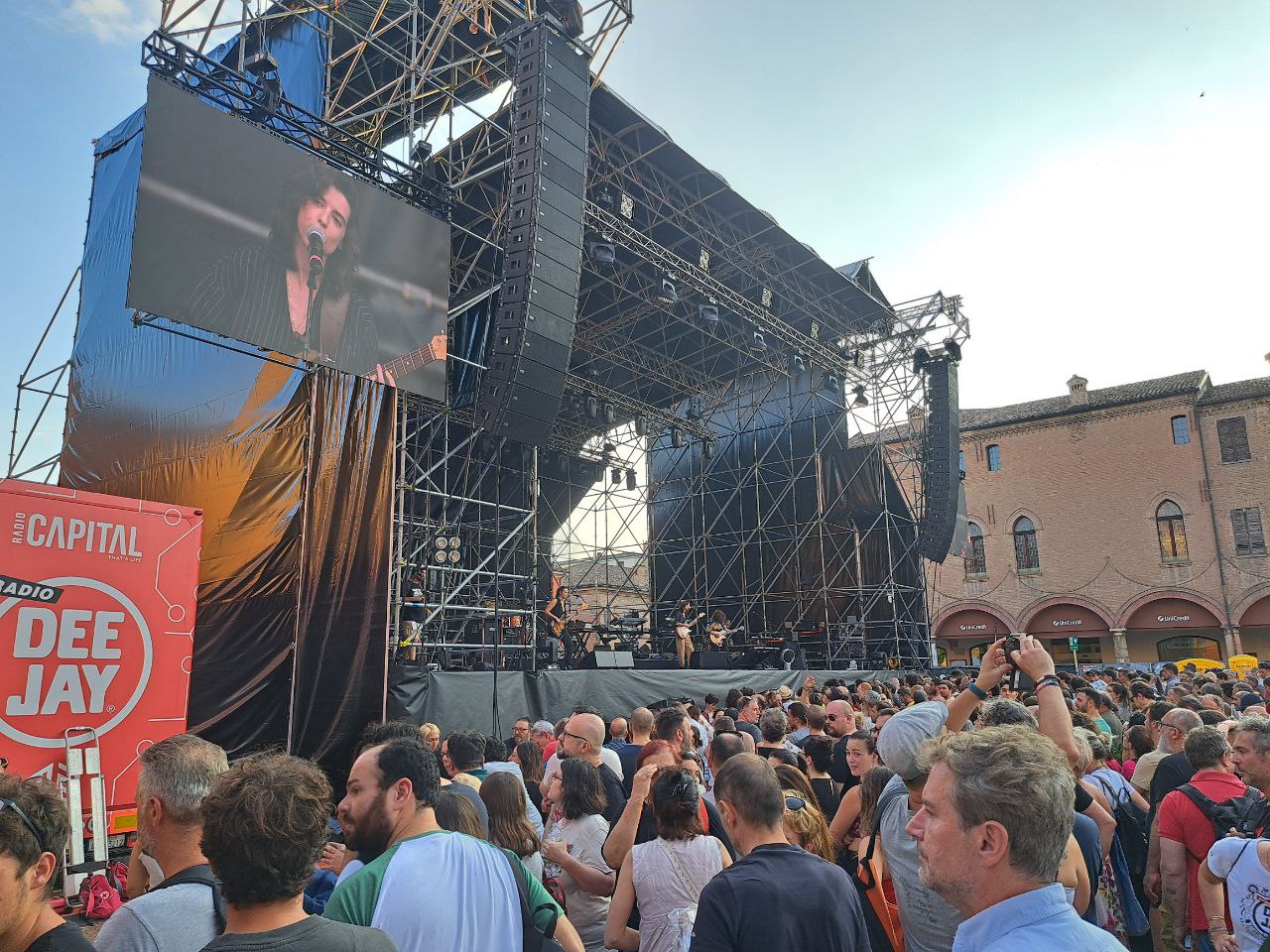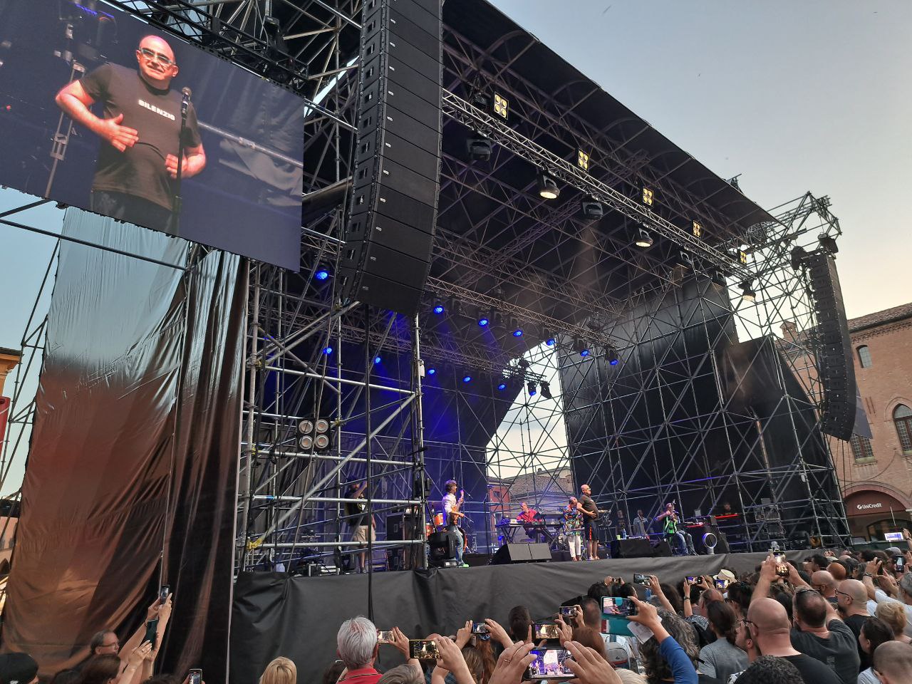 Il racconto: Arrivati a Carpi, nel primo pomeriggio del 2 luglio, ci si rendeva conto dell’importanza dell’evento per la cittadina: l’intera piazza era stata transennata e posta off limits per i pedoni. Si sentiva già la musica e persino alcune piccole anticipazioni di quello che sarebbe stato. I fan erano già tanti per strada, li riconoscevi subito dalle magliette. I negozi, quelli aperti di domenica, nel pomeriggio si ritrovarono così con una marea di clienti da sfamare più del solito.