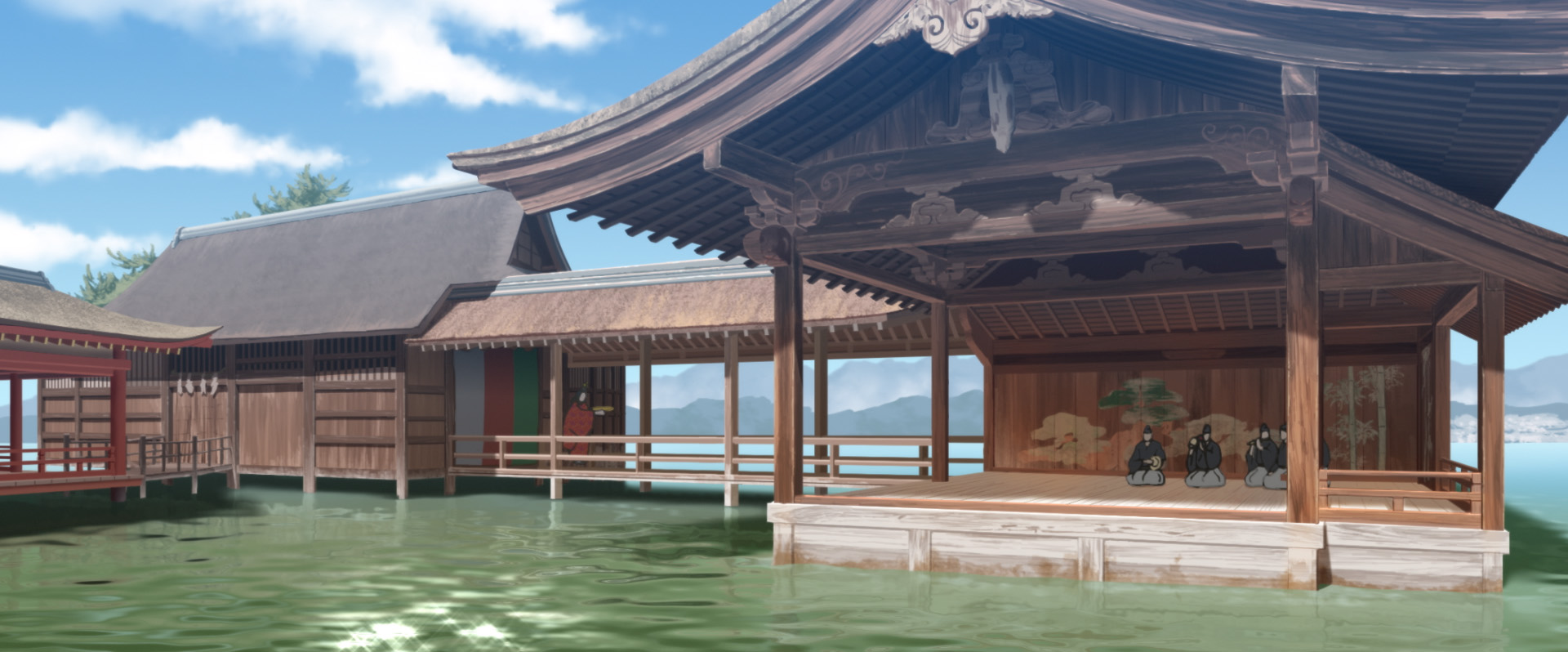 Man mano che il film avanza, la narrazione si lega sempre di più alla rappresentazione teatrale, arrivando poi ad essere portata avanti proprio dai vari spettacoli messi in scena dal duo di protagonisti. Il teatro nō è un’arte teatrale precedente al più noto teatro kabuki. In genere questa forma teatrale è caratterizzata da testi che possono essere liberamente interpretati, cantati lentamente dal teatrante che in genere indossa una tipica maschera.