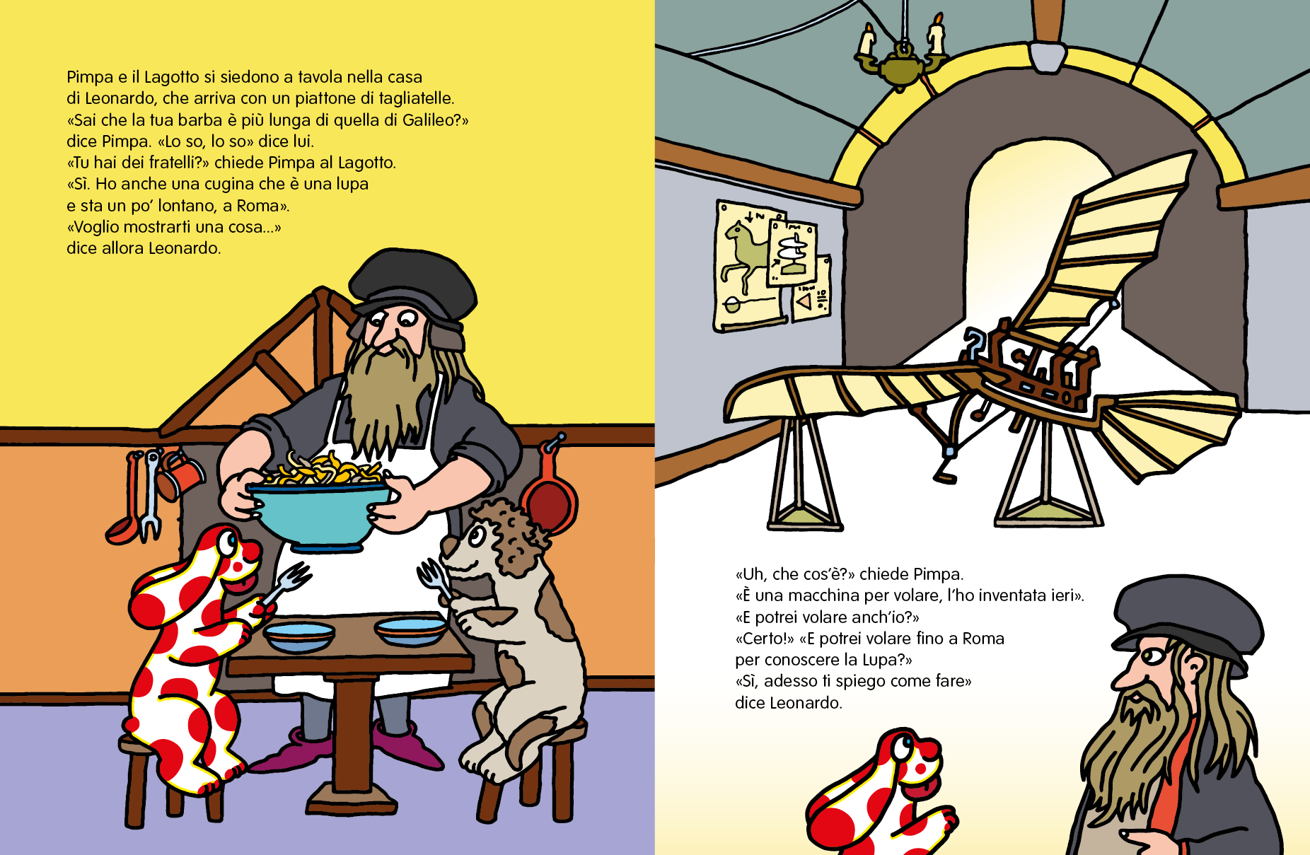 Partendo dalle Alpi e arrivando alle isole, Pimpa viaggia attraverso lo stivale e incontra grandi scienziati e artisti del passato, come Galileo Galilei e Leonardo da Vinci, e i protagonisti di famose opere italiane, come la Gioconda e l’Aida.