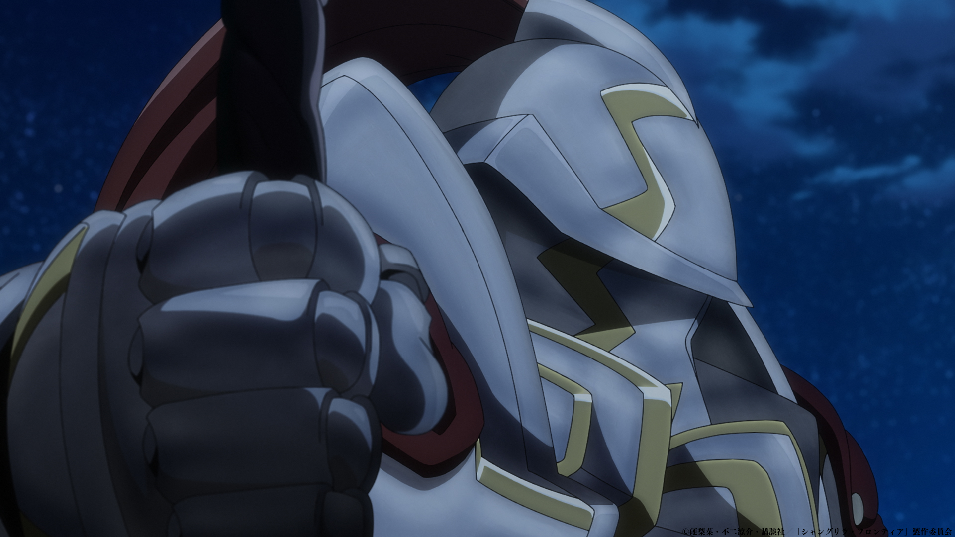 È qui che la costruzione del mondo e l’attenzione alle meccaniche di gioco iniziano davvero a prendere il sopravvento. Chi è fan di Sword Art Online e Log Horizon o anche solo un fan degli MMO, sarà sicuramente colpito da Shangri-La Frontier, soprattutto se si è appassionati dei dettagli e della meccanica di gioco. Infatti uno dei maggiori punti di forza è che lo spettacolo non sembra avere nessuna particolare sottotrama o espediente pericoloso. Oltre alla sua leggerezza, un altro importante punto di forza di Shangri-La Frontier è sicuramente l’animazione; questo non è un caso, visto e considerato che il registra della serie è Toshiyuki Kubooka, autore di Gunbuster, Giant Robo e Berserk (the Golden Age Arc). Ogni scena dei primi nove episodi presenta un’animazione incredibilmente fluida, tale che sembra che sia lo spettatore a giocare con la propria console.