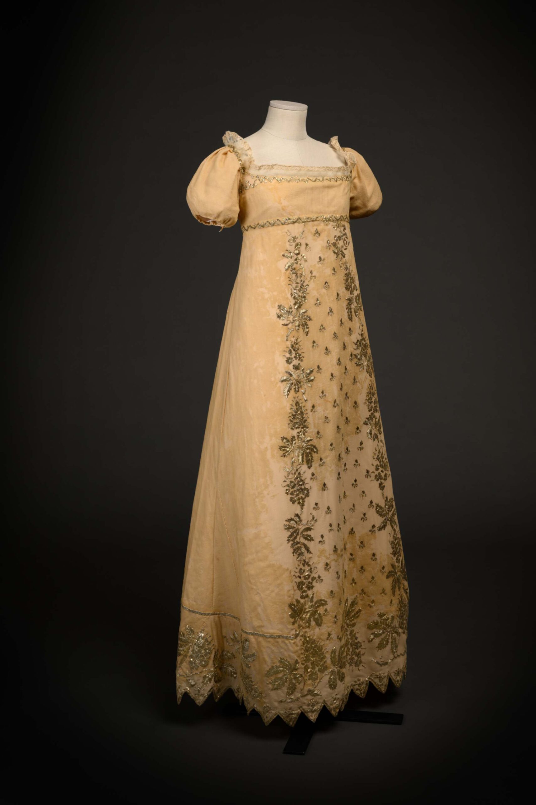 Nelle sale appena inaugurate si possono ammirare lussuosi abiti settecenteschi quali tipici esempi di robe à la française, degni rappresentanti di un’epoca in cui è la corte a stabilire le mode del vestire, secondo una logica del potere stabilita dai regolamenti d’etichetta. Vi sono poi capi in stile Impero, come quello in crêpe di seta avorio, ornato da ricami in laminetta d’argento, appartenuto a Massimilla Celano, consorte di Prailo Mayo, terzogenito del governatore del Principato abruzzese di Francavilla. Questo vestito testimonia come durante il periodo napoleonico gli indumenti diventino più confortevoli per permettere al corpo di muoversi senza costrizioni e, in assonanza con il classicismo grecizzante molto diffuso al tempo, l’abito assuma, per analogia, la forma di una colonna. Si prosegue con capi del periodo Restaurazione, quando il punto vita si riabbassa ed elaborate applicazioni affiorano dalle vesti come bassorilievi scultorei: se ne trova testimonianza nell’abito da pomeriggio datato 1825, in taffetas a pelo strisciante operato a motivi di righe e palmette. Lungo il percorso sono esposti anche rari abiti da sposa ottocenteschi, come il modello in seta dorata adornato da un motivo di peonie e margherite, appartenuto ad Angiola Polese, giovane nobildonna sposatasi nel 1836; oltre al raffinatissimo abito da sposa, realizzato da Charles Frederick Worth, in raso e gros de Tours color avorio, con voluminosa tournure e generoso strascico, luminoso esempio del virtuosismo sartoriale dell’epoca. Le mise da sera sono invece protagoniste della moda fin de siècle, e tra queste spicca il vestito in rete ad ago meccanico nera su raso di seta avorio di Catherine Donovan, celebre couturière newyorkese definita dal New York Times come la sarta pioniera che aveva vestito la élite cittadina: i Goelet, gli Astor e i Vanderbilt erano infatti stati suoi mecenati e assidui frequentatori dell’atelier di Madison Avenue. Firmato Raphael Goudstikker, è invece la veste Liberty in chiffon giallo e verde appartenuto alla contessa Margaret Brinton White Savorgnan di Brazzà. La decorazione-gioiello di perline e cannucce di vetro che scende dal petto sino alla vita è perfettamente rappresentativa delle sfarzose preziosità della moda Belle Époque. Ai sofisticati abbigliamenti d’inizio Novecento è infine dedicata una sala, ispirata al clima estetizzante dell’epoca, sull’onda della nuova liberazione del corpo femminile incarnata dalle forme a tubolare delle creazioni di Mariano Fortuny per Eleonora Duse e dalla veste da casa a Kimono di Donna Franca Florio di Jacques Doucet, padre della moda francese, grazie ai suoi interior dresses, tra i sarti più amati dalle dive del tempo. Completano l’esposizione una suite di dipinti – scelti a domostrazione di quanto il costume sia integralmnete un fenomeno culturale e spesso artistico – e una selezione di oltre sessanta accessori tra scarpe, cappelli, ventagli, parasole, borse, che arricchiscono la collezione rendendola una delle più importanti al mondo.