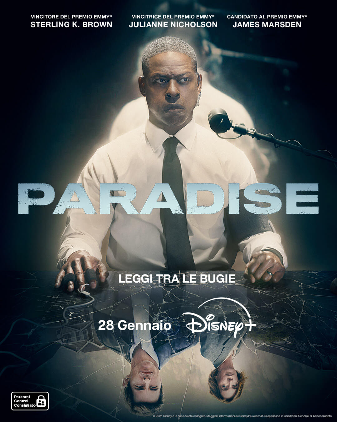 14 novembre 2024 – Disney+ ha diffuso il trailer e la key art di Paradise, la serie drama di Dan Fogelman interpretata da Sterling K. Brown, James Marsden e Julianne Nicholson, che debutterà il 28 gennaio 2025 sulla piattaforma streaming con 3 episodi disponibili al lancio, seguiti da uno a settimana.